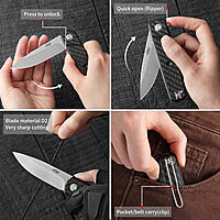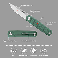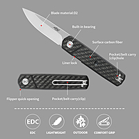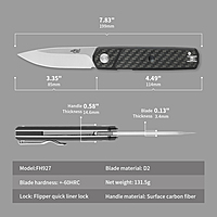 Model: FH927 (BK/CF/GB) Overall length: 199 mm Blade length: 85 mm Handle length: 114 mm Handle thickness: 14.6 mm Blade thickness: 3.4 mm Blade material: D2 Blade hardness: +-60HRC Handle material: G10 Net weight: 131.5 g Lock: Flipper quick liner lock