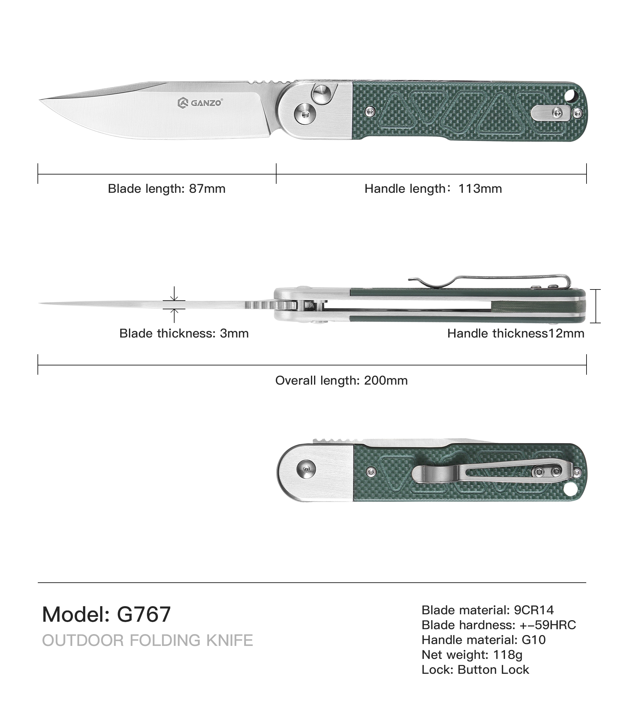 Type: Folding Knife Overall length: 200 mm Blade length: 87 mm Handle length: 113 mm Handle thickness: 12 mm Blade thickness: 3 mm Blade material: 9CR14 Blade hardness: +-59HRC Handle material: G10 Net weight: 118 g Lock: Auto Lock