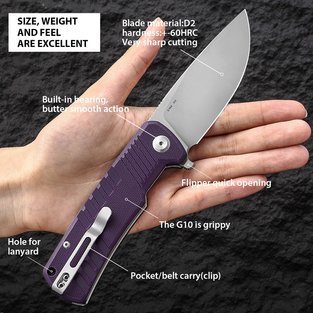 Overall length: 202 mm Blade length: 90 mm Handle length: 112 mm Handle thickness: 13 mm Blade thickness: 3.5 mm Blade material: D2 Blade hardness: +-60HRC Handle material: G10 Net weight: 135.8 g Lock: Flipper lock
